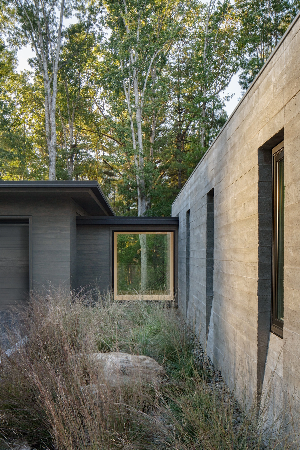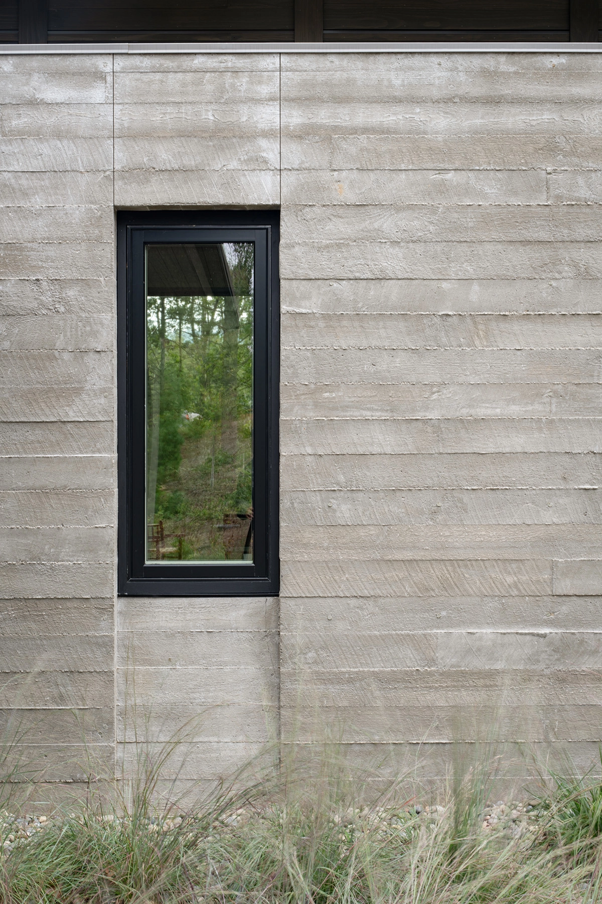 Designed with a focus on efficient living and sustainability, Fern Grove embodies a minimal and comfortable aesthetic. The board-formed concrete walls give the impression of modern ruins, while the dark natural siding and low-sloped roof help the house blend seamlessly with the land. Surrounded by mature trees and set amidst a bed of ferns, the house embraces its natural environment.