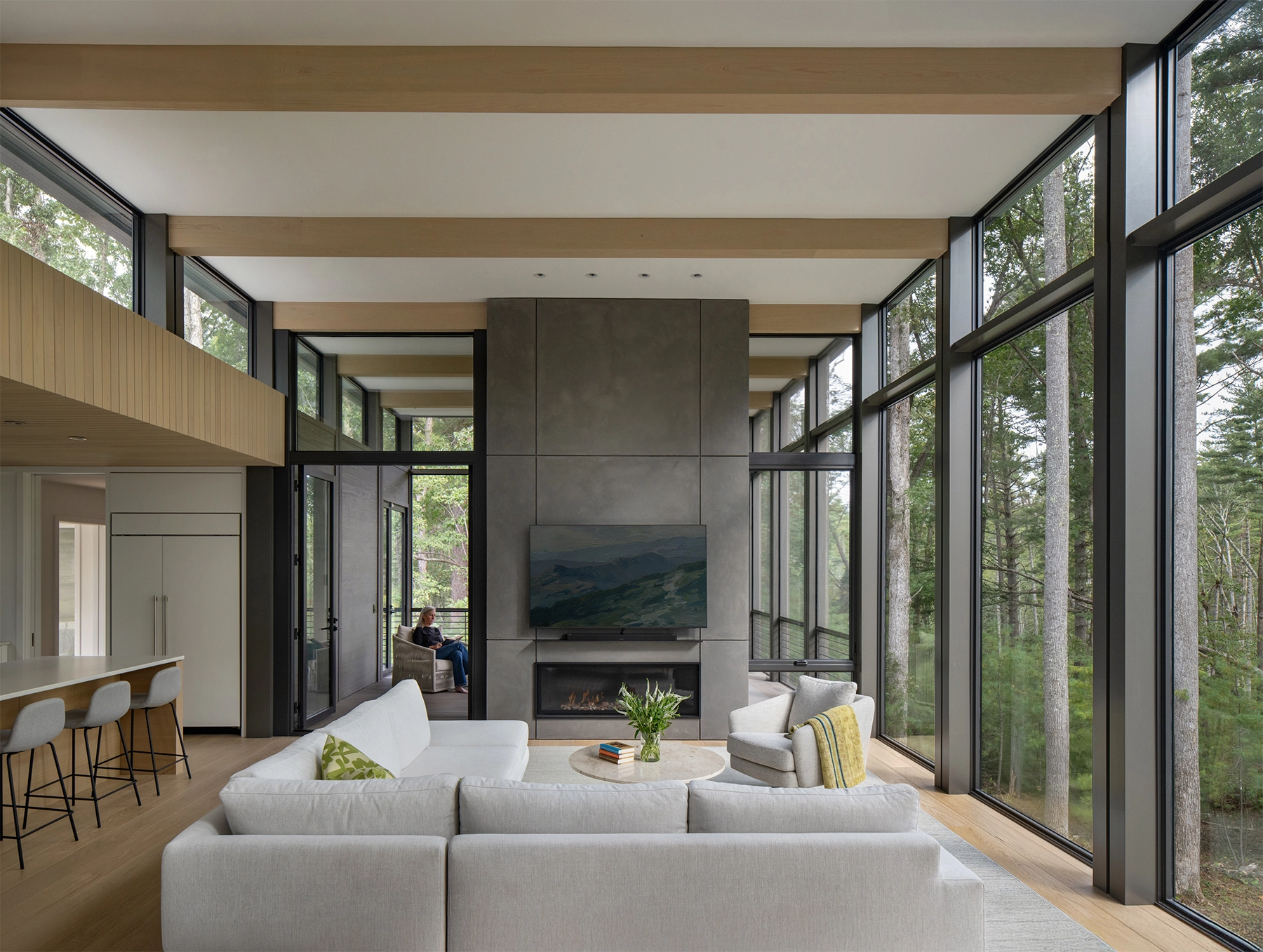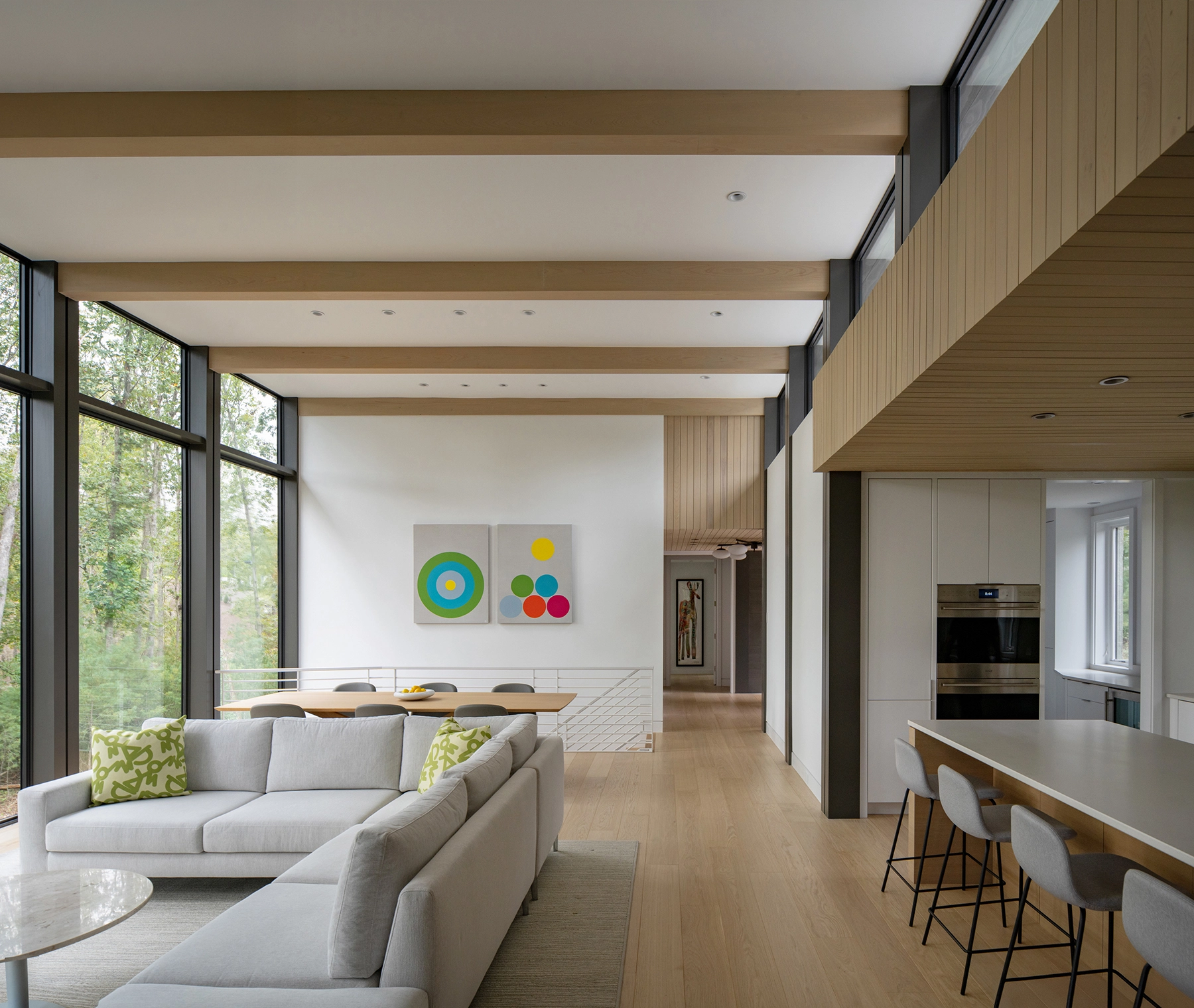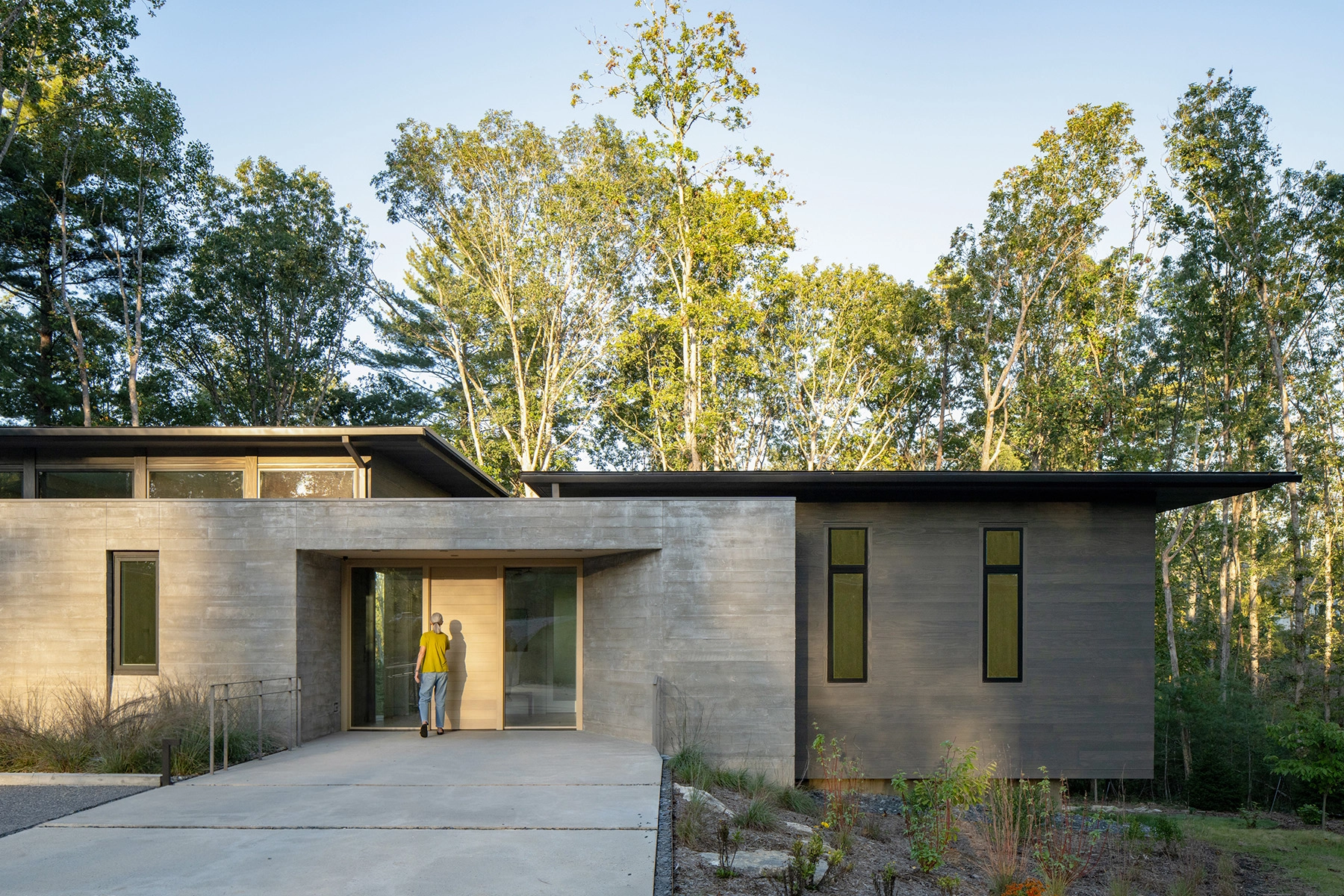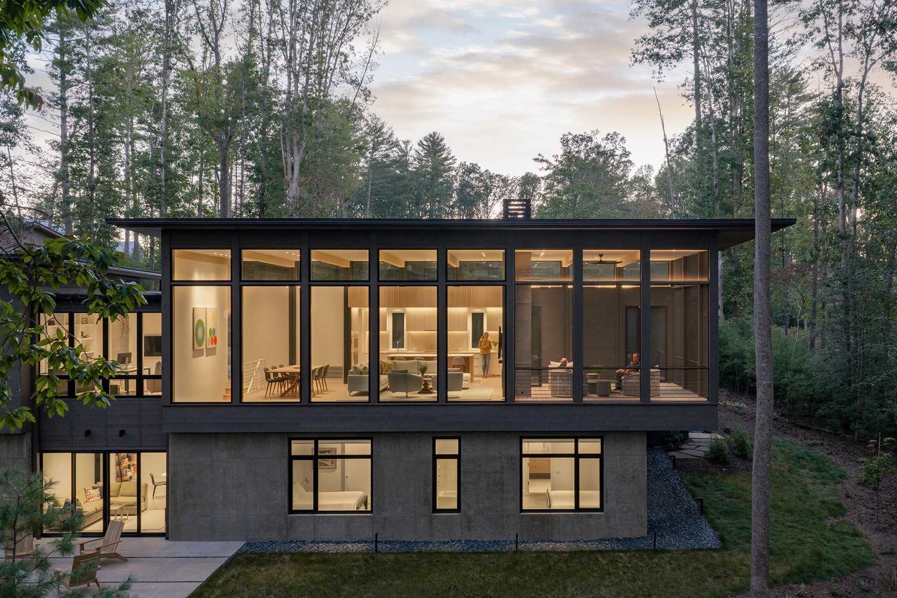Located at The Ramble in Biltmore Forest, Fern Grove is an unassuming and modern house carved out of concrete surrounded by ferns and a dense forest. The house is designed with two cantilevered wood and glass boxes resting atop a concrete plinth, their thin monoplane roofs extending like wings. The primary facade is wrapped in beautifully crafted board-formed concrete walls, grounding the house and connecting all its elements.