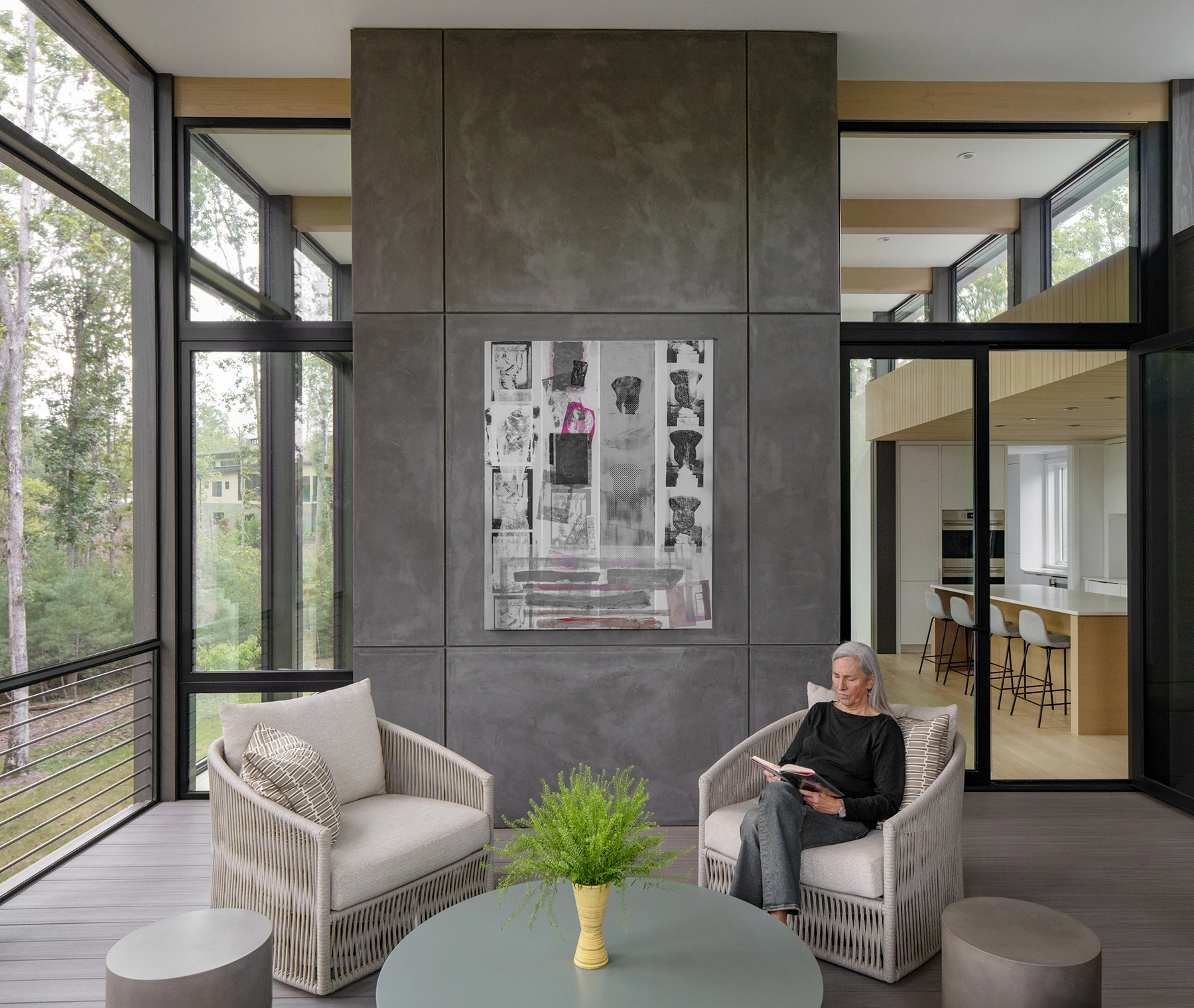 The exterior siding seamlessly blends into the entryway and wraps around the screen porch, blurring the boundaries between indoor and outdoor spaces. Approaching Fern Grove, guests wind their way through the trees to reach the drive court and cross a “rain garden bridge” that adds a touch of enchantment. The exterior siding seamlessly blends into the entryway and wraps around the screen porch, blurring the boundaries between indoor and outdoor spaces.