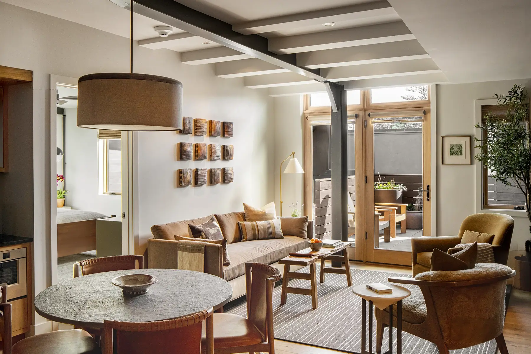 The interiors are composed of warm tones and natural materials that reflect the surrounding Blue Ridge Mountains. Each apartment is unique with refined interiors that feel cozy, inviting, and sophisticated. The existing steel structure was left exposed to help tell the story of the history of the building.