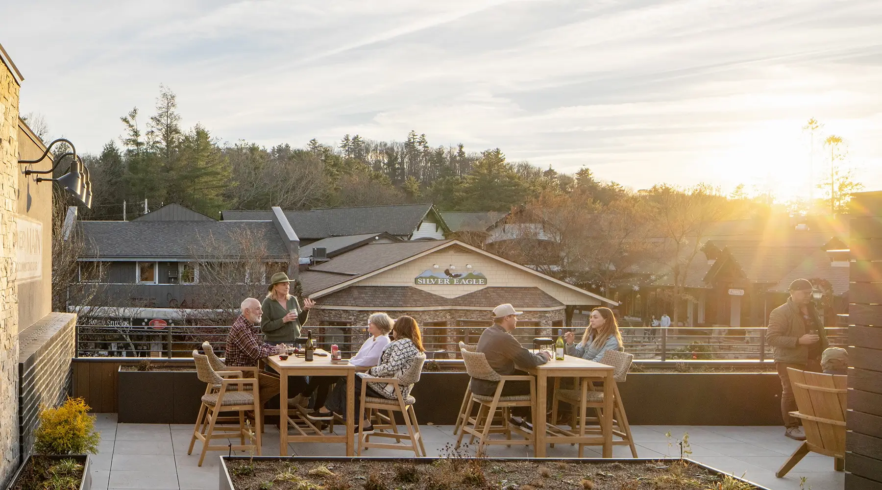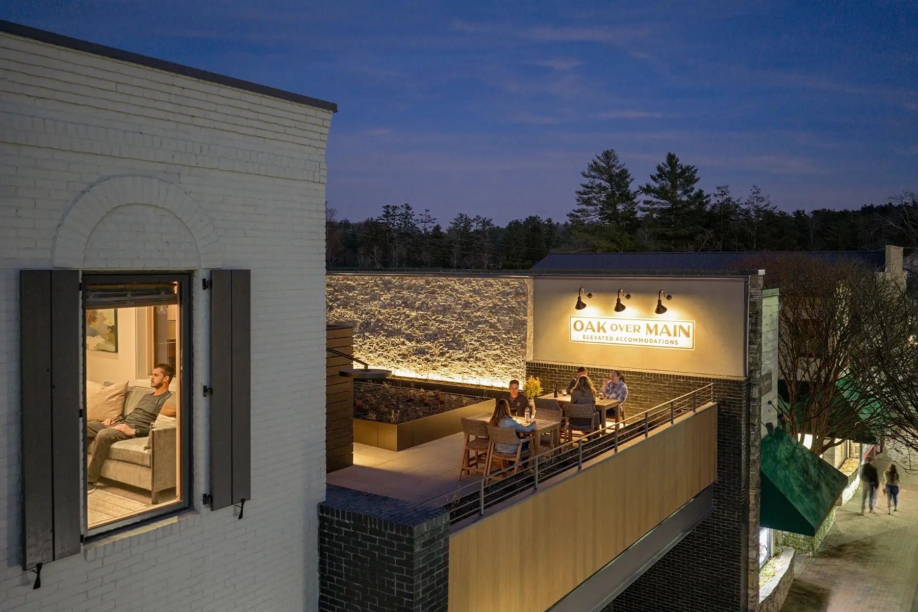 The four luxury rental apartments provide valuable and rare downtown lodging in Highlands. Each apartment features its own private terrace that opens into the rooftop garden with walkways, native plants, and a communal patio overlooking Main Street. This green space connects guests to nature while still having the convenience of downtown living.